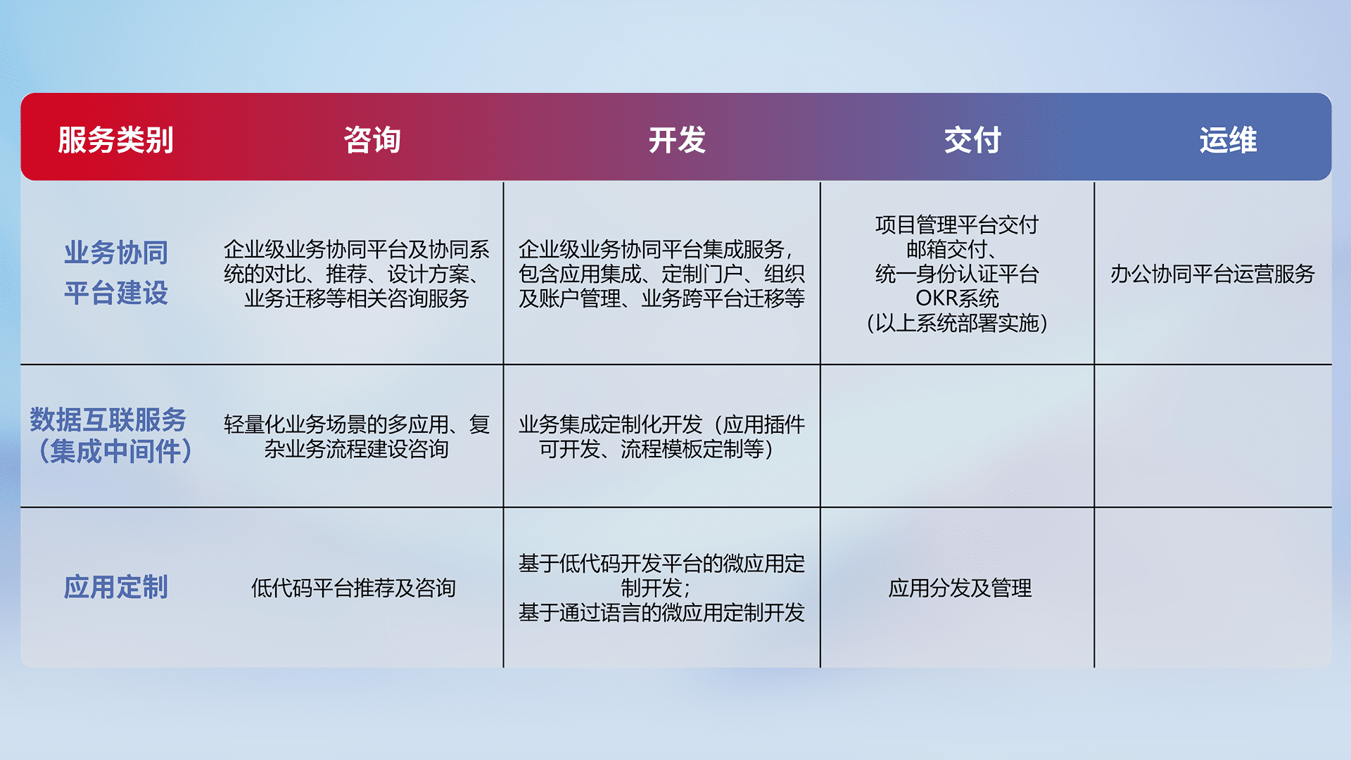 针对钉钉、、、企微、、、IDaas等平台级产品提供产品的规划、、、方案、、交付、、、定制化开发等服务,,,,实现如统一协同办公、、、、智能客户服务、、混合会议管理、、智能数据查询、、等业务场景,,,实现数字化转型。。。